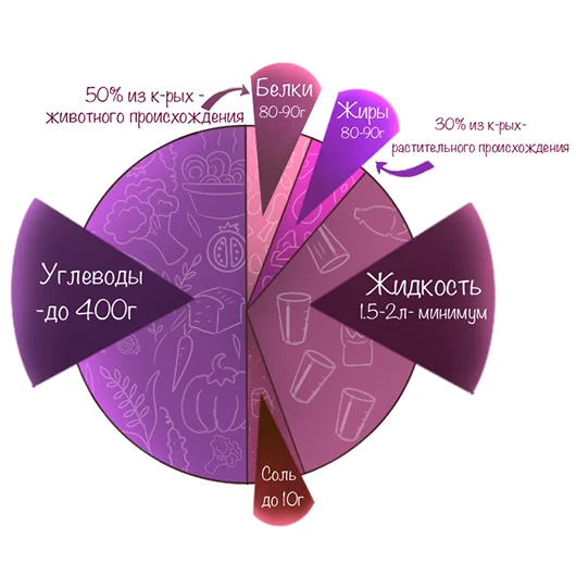 Общий объем пищи снижается за счет жиров и углеводов, белки – на нижней границе физиологической нормы. Свободная жидкость тоже по нижней границе нормы (1.5–2 л). Рацион обогащается витаминами и минеральными веществами.